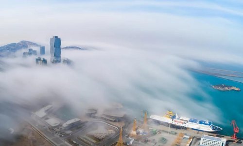 2月21日,连云区上空出现平流雾景观,云雾缭绕霞光辉映,片片云雾蜿蜒飘荡,将东部城区点缀装扮得美丽壮...